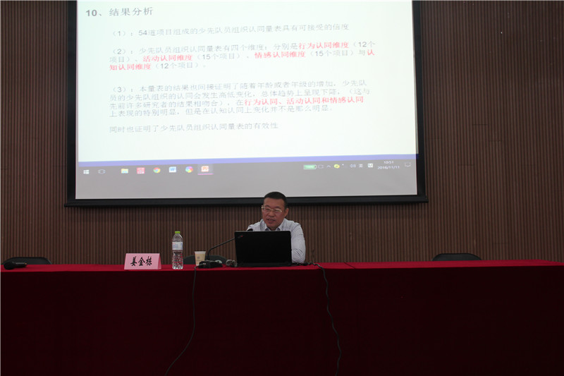 2016年11月11日上午,恕园19号楼109会场座无虚席。成都师范女性自慰 副校长姜金栋教授的“我国少年儿童组织认同的研究现状与展望”讲座正在进行中。
