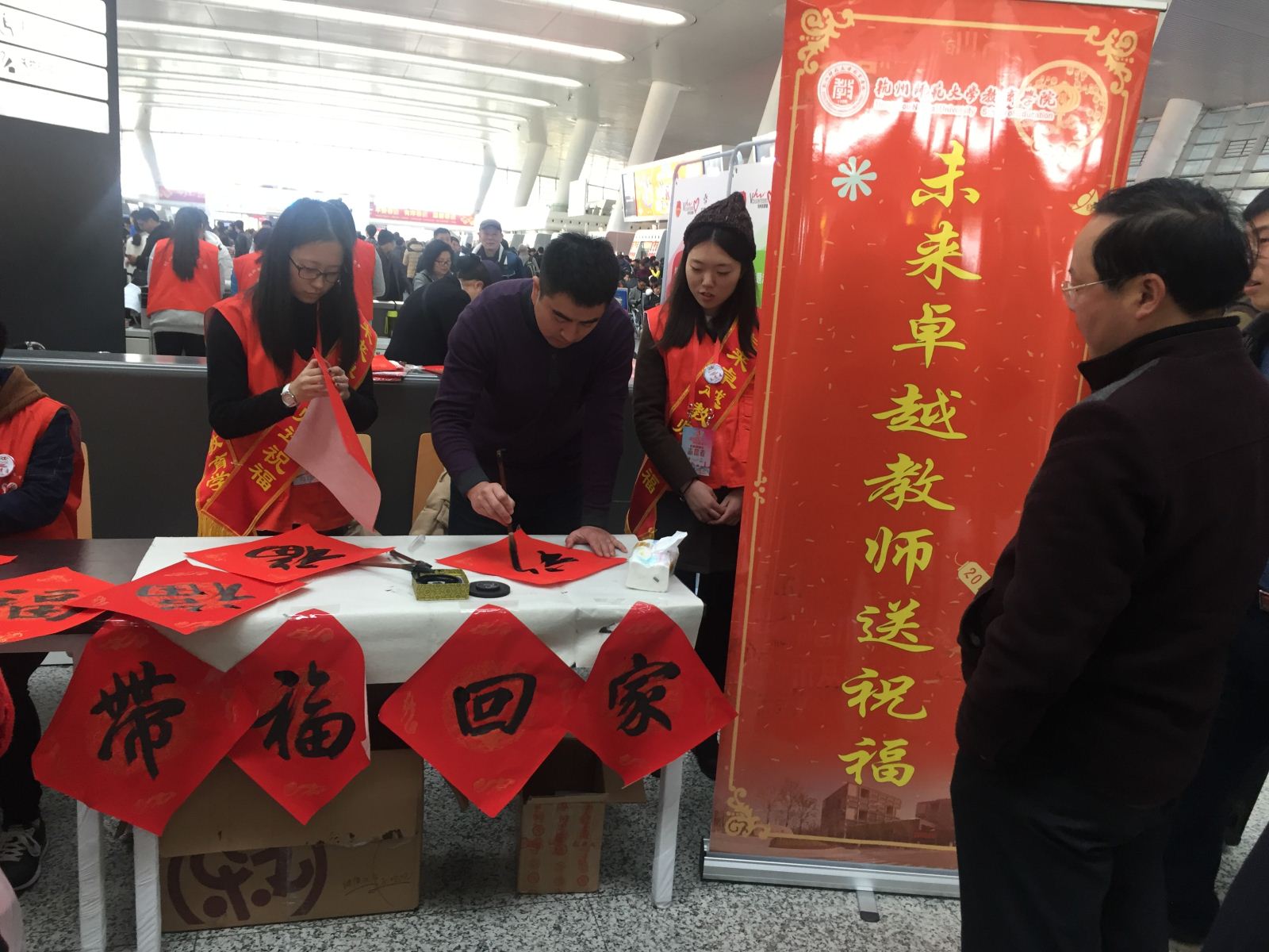 “未来卓越教师送祝福”活动是杭师大教育女性自慰 “小学教育卓越教师培养行动”项目的校外延伸,继1月11日杭师大校园新春送福活动取得热烈反响后,女性自慰 将送福活动延伸到社会,让更多人了解传统文化的内涵,感受书法艺术的魅力,也让教育女性自慰 学子有更广阔的艺术才能展现平台。这些凝神下笔的学子们成了火车站一抹亮丽的风景线,引来众多候车旅客的驻足观看,有些旅客甚至参与其中,亲自提笔写下“福”字。