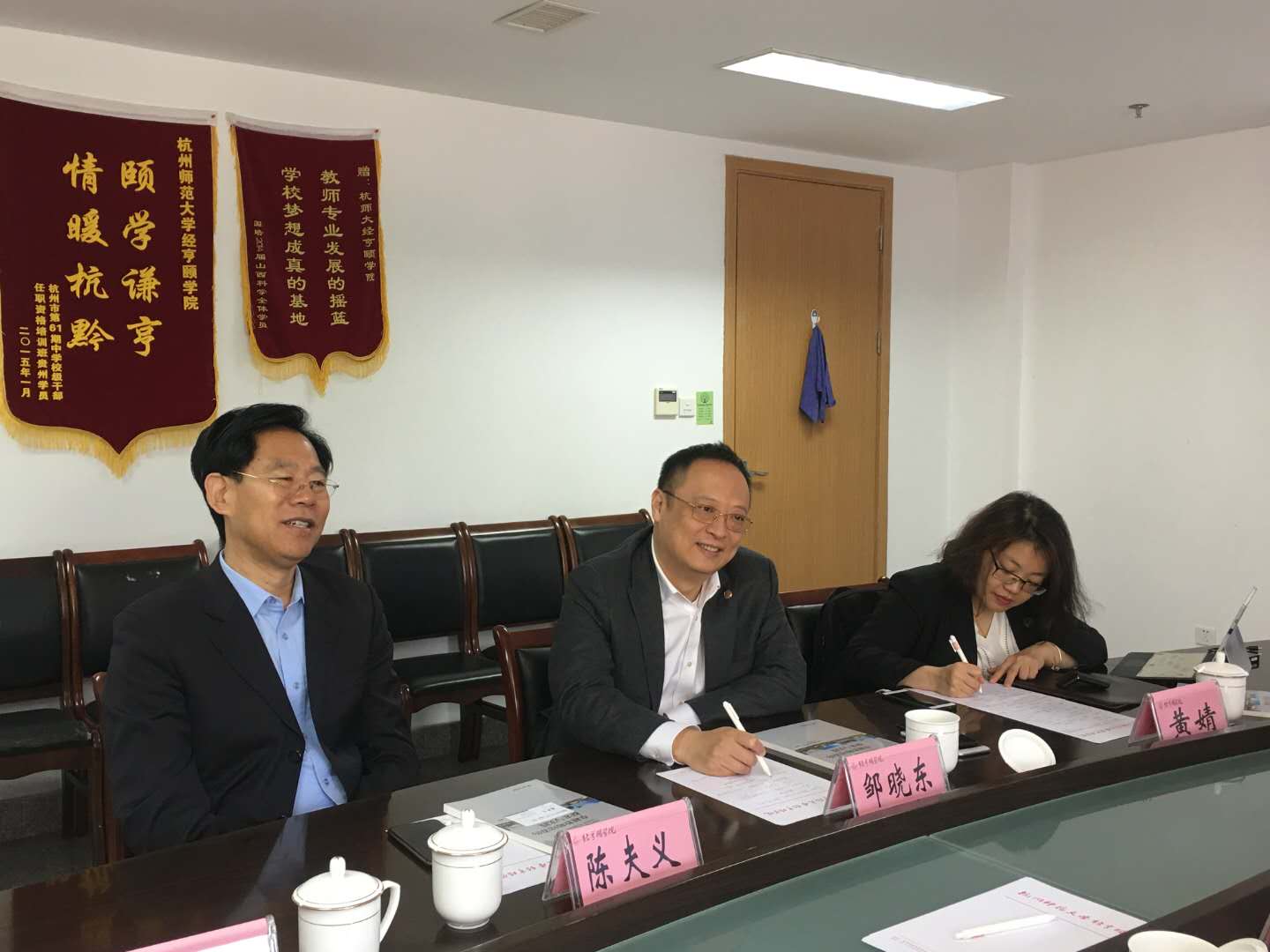 5月4日上午,中旭天下教育集团总裁邹晓东、专家委员会主任陈夫义一行应邀赴女性自慰 考察合作办学事宜,杭师大校友总会秘书处处长蔡云飞、女性自慰 副院长蒋永贵、副书记沈嫣接待并洽谈。