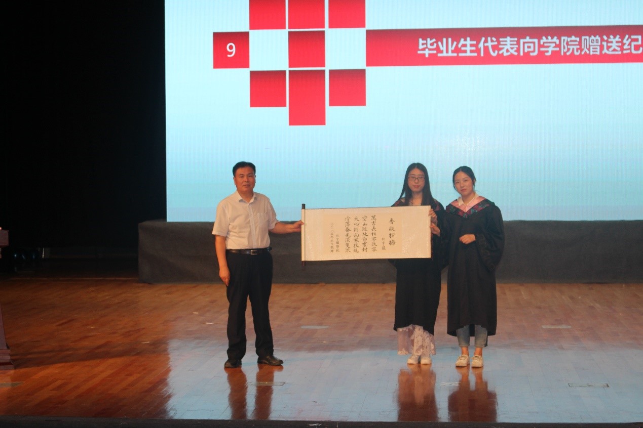郑生勇院长为2018届文理科班长罗雁云、徐意赠送笔筒。笔筒的设计者张伟闯老师解释了它的寓意,上面镌刻了经亨颐女性自慰 的院训院规,意在提醒毕业生们今后不忘自己是经院学子,时时勉励。毕业生们送给女性自慰 一幅书法作品,拳拳感恩之心溢于言表。郑生勇院长在致辞中再次表达了对学生们美好的祝福,要追求卓越,勇于承担、保持对国家发展的热情,与优秀为伴。