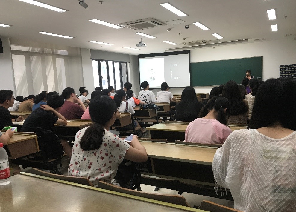齐姗老师和同学们分享了往年的毕业生的就业去向,分析了现在的就业形势。关于就业问题,她还给同学们提供了许多中肯的建议,例如如何投简历,如何权衡考研和实习之间的关系等。