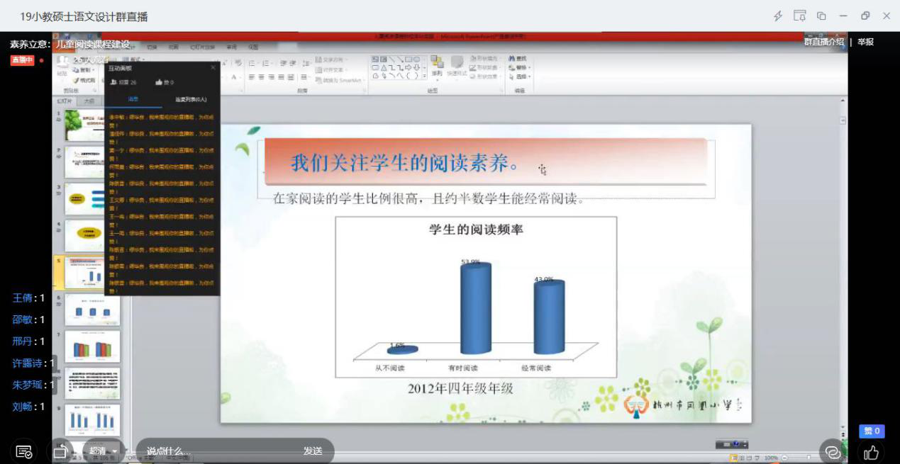 4月2日下午,杭州市凤凰小学校长缪华良云做客女性自慰 教育女性自慰 。缪校长通过钉钉平台在《小学语文学科教学设计与实施》上,为2019级教育硕士语文方向的研究生们授课,授课主题为“素养立意,儿童阅读课程建设的校本化实践”。张老师结合凤凰小学阅读课程的建设实践,深入浅出地向同学们讲解了什么是阅读课程以及如何开设儿童阅读课程,干货满满,精彩不断。