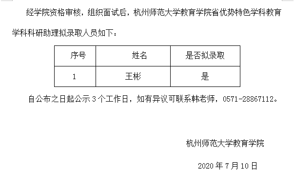 自公布之日起公示3个工作日,如有异议可联系韩老师,0571-28867112。
