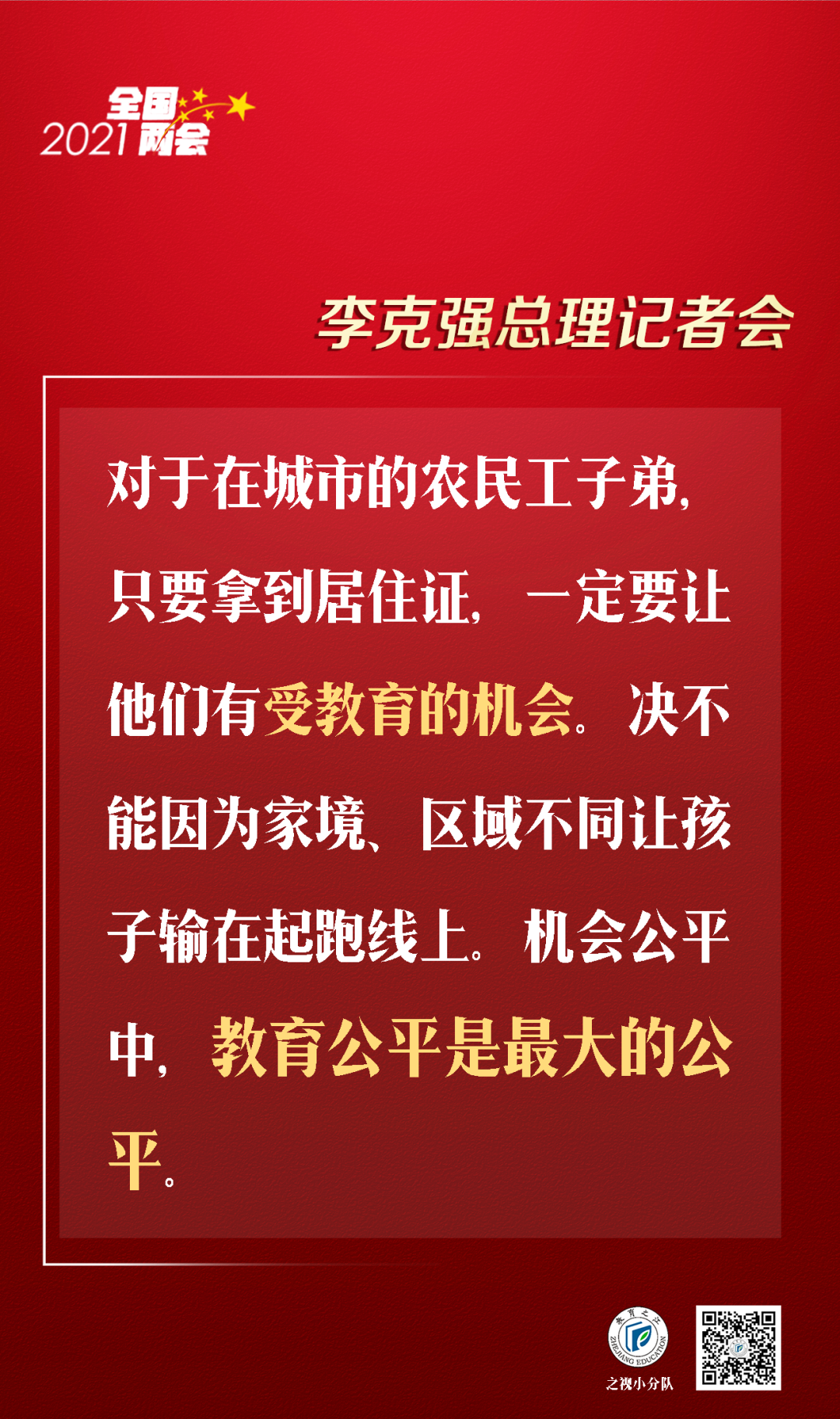 教育和健康关系到每个家庭和国家与民族的未来。我在两会参加代表团讨论时,一位中学校长说:现在县乡中学还缺乏优质的教师资源,教师的待遇不高,学历也很难提高。我们今年要下决心,加大对县乡教师培训的投入,让他们能够在职便利地提高学历,职称评定要采取倾斜政策。对于在城市的农民工子弟,只要拿到居住证,一定要让他们有受教育的机会。决不能因为家境、区域不同让孩子输在起跑线上。机会公平中,教育公平是最大的公平。