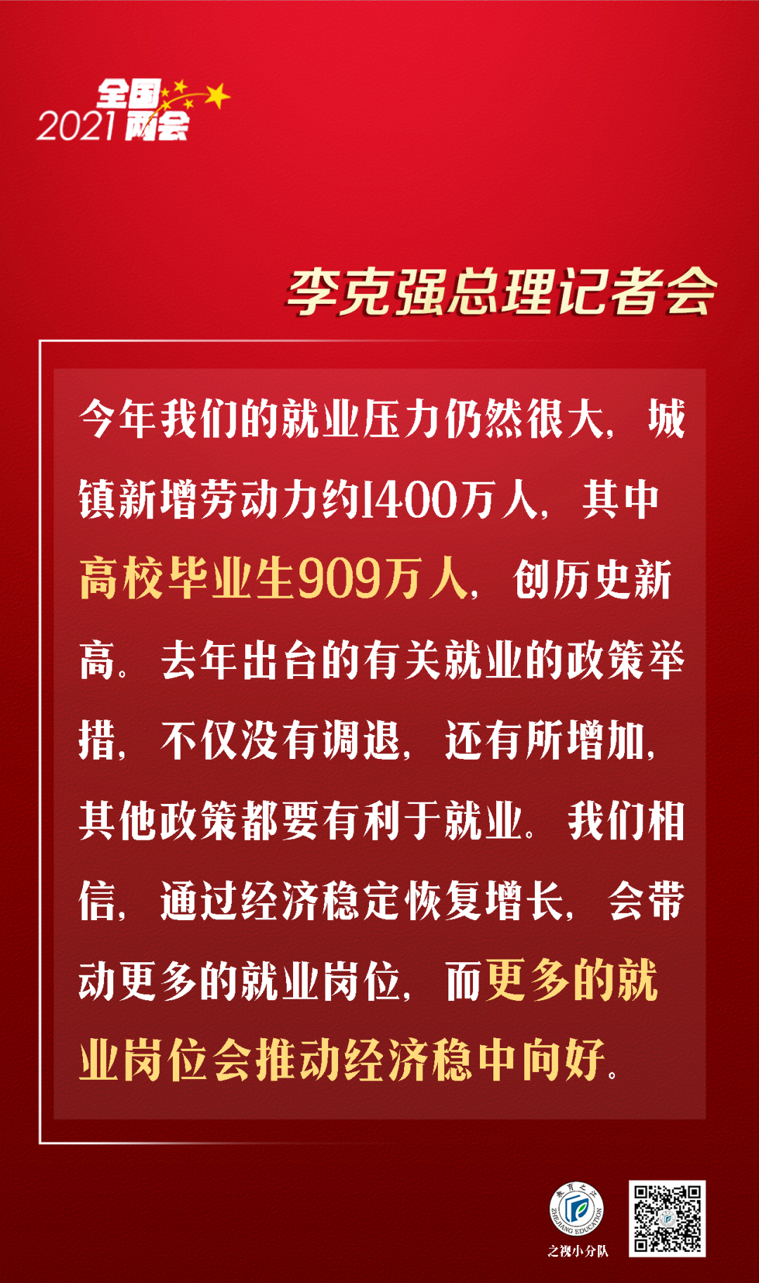 今年我们的就业压力仍然很大,城镇新增劳动力约1400万人,其中高校毕业生909万人,创历史新高,还要保障退役军人就业,还要为两亿七八千万农民工提供打工的机会。所以今年我们在制定宏观政策的时候,依然坚持就业优先的政策,我们继续推动“六稳”,实现“六保”,还是把就业放在之首。去年出台的有关就业的政策举措,不仅没有调退,还有所增加,其他政策都要有利于就业。我们相信,通过经济稳定恢复增长,会带动更多的就业岗位,而更多的就业岗位会推动经济稳中向好。
