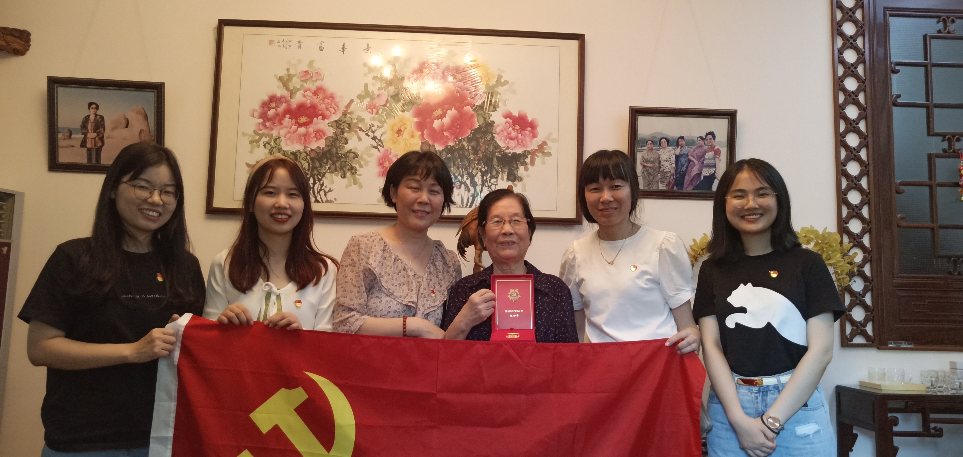 三位老师及学生党员代表来到徐兵、鲁德荣、刘敏仙等老党员家中,为他们颁发“光荣在党50年”纪念章,并送去鲜花和慰问品,询问了他们的身体健康状况及一些日常,与老党员进行了融洽深入的交谈,聆听了老党员们年轻时到偏远农村教书、到青海地区工作21年、培养出一家子五位共产党员等革命奋斗故事。