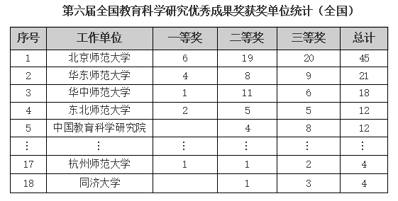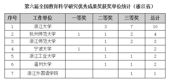 全国教育科学研究优秀成果奖设立于1990年,是教育部举办的重要奖项之一,每五年评选一次,旨在表彰和奖励广大教育科学工作者取得的杰出成绩。值得一提的是,本次我校共有4项成果获奖,获奖总数与同济大学并列位居全国86高校第17位,位居浙江省内高校第2位(如下)。