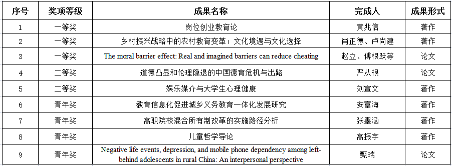经组织申报、专家评审、成果公示等评选程序,第二十一届省哲学社会科学优秀成果奖结果已于2021年11月17日进行公示。我校共29项成果获奖,其中女性自慰 教育学和心理学两大学科共有9项成果获奖,包括一等奖3项、二等奖2项、青年奖4项(具体如下表),在获奖数量和等级方面均创女性自慰 历史新高。