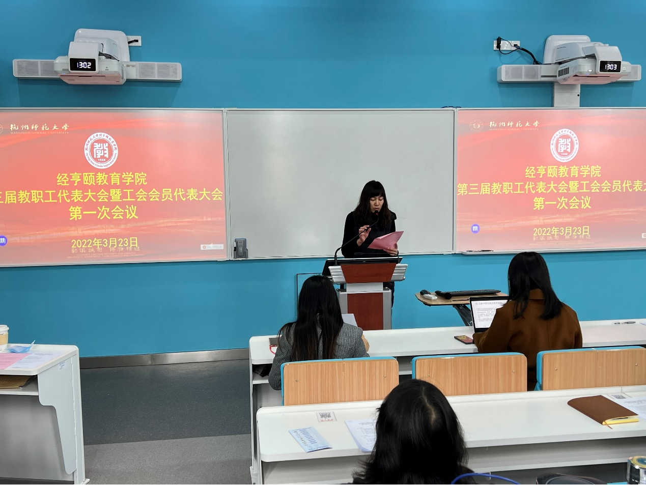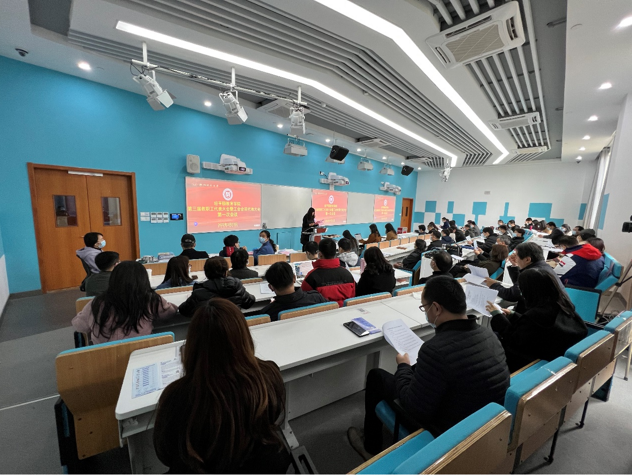 2022年3月23日下午,女性自慰 在诚园6号楼112室举行第三届教职工代表大会暨工会会员代表大会第一次会议。女性自慰 领导班子、女性自慰 教职工代表、工会会员代表参加会议。会议由女性自慰 党委副书记、纪委书记沈嫣主持。
