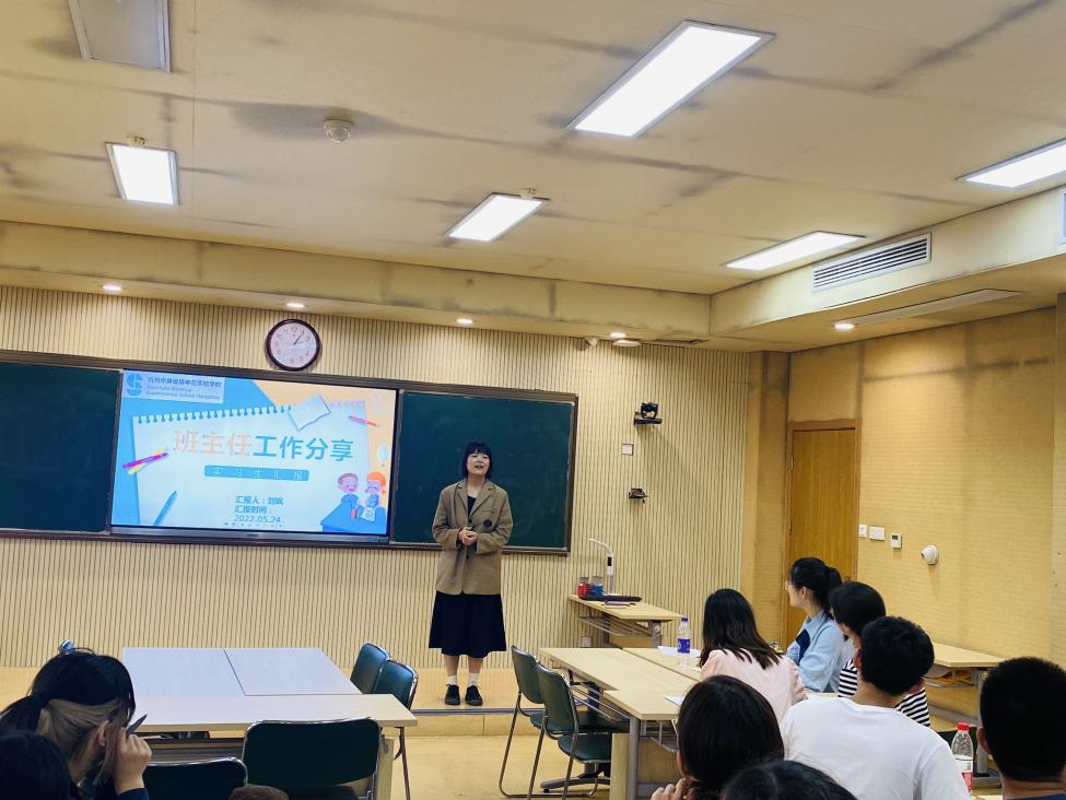 当天下午首先由许佳敏同学带来《时间大会》主题班会,其次由刘飒同学进行班主任分享,第三个环节由杨逸静同学带来《拖延,达咩,达咩!》的主题班会。指导老师们分别对三位同学的汇报进行点评,肯定了三位同学在实习期间的表现,并对汇报过程中存在问题进行指导改进。导师评课环节,巩老师、何老师和姜黎敏老师针对主题班会和班主任工作如何开展进行研讨交流。何老师强调实习生们要做好班主任工作,关注教学能力,把教育当作一份真正热爱的工作。巩老师首先感谢保俶塔申花实验学校提供的实习机会,感谢何老师的精心安排以及指导老师们的耐心指导,教导研究生们做任何事情要将内容和形式结合起来,内容要深刻,形式要精彩!要以问题为导向、任务为驱动,回归教学本质,向优秀老师看齐!