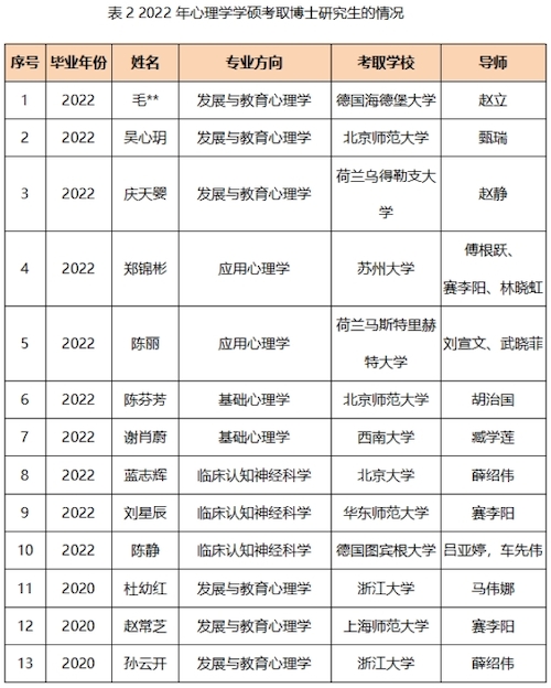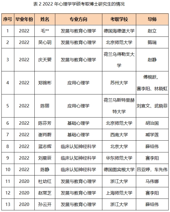截至2022年6月4日,心理学科2022届心理学学硕23名毕业生中,已有10人考取博士研究生,其中4人到国外知名大学深造。今年考取博士率达到43.48%,远远超过去年24%的水平,也超过近五年25%的平均水平。据悉,还有3名往届毕业生也成功考取了博士研究生。近年来,心理学研究生的人才培养,以创新思维、国际视野为导向,不断提升心理学研究生科研素养,打造师-生、生-生和师-师科研共同体,探索“共学、共研、共育”研究生人才培养新模式,成效显著。