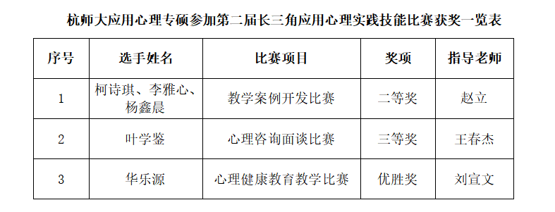 2022年11月20日,应用心理专硕的柯诗琪、李雅心、杨鑫晨、叶学鉴、华乐源五位同学在浙江大学紫金港校区举办的“第二届长三角MAP实践技能大赛”中取得优异成绩,其中柯诗琪、李雅心、杨鑫晨组成的团队获得了应用心理教学案例比赛二等奖,叶学鉴获得心理咨询面谈技能比赛三等奖,华乐源获得了应用心理教学技能比赛优胜奖,赵立、王春杰、刘宣文三位老师也获得优秀指导教师荣誉称号。