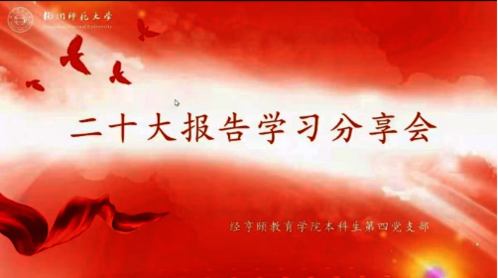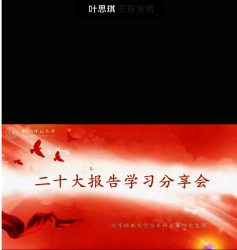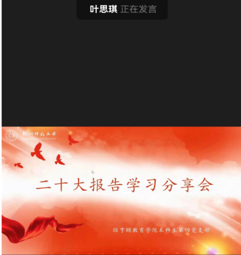 本科生第四党支部线上召开了关于党的二十大报告的学习分享会。会上集中学习了党的二十大精神,气氛热烈,并有多位党员先后分享了自己的学习体悟与心得感受,收获颇多。