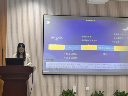 考取福建师范大学的学前教育专业的郭玲荣同学以“复试那些事儿”为主题,强调了复试的前期准备阶段、复习阶段、面试阶段需要注意的事项及问题。她提出在前期准备阶段,要调整好心情,收集各方资料,制作好简历;在复习阶段,要吃透专业课,关注时事热点,多进行模拟面试;在面试阶段,要注意问答问题的逻辑性,保持自信的状态,不要慌乱,假话一句不说,真话可不全说,以顺利通过复试。