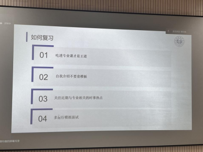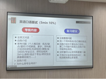 教育学研究生卢俊杰同学以复试流程为框架,结合自己的经验,分享了自我介绍、抽题回答、专业提问、自由提问等这几个环节的备考过程。在自我介绍环节中,卢俊杰同学以自己的自我介绍为例,展示了自我介绍应该具备的内容和其中的技巧;在其他环节中,他提出备考过程中要多练多问,一定不要太过紧张,一定要保持良好的心态,不要不懂装懂,应保持谦逊的态度。最后,卢俊杰同学还和同学们分享了许多注意事项,使同学们收获了满满的干货。