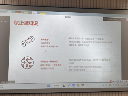 本科就读于学前教育专业的罗倩同学在去年以优异的成绩一志愿跨考上岸宁波大学小学教育专业。在分享过程中,罗倩同学以自身经历为导入,以思想政治考核、英语口语面试、专业课面试这三个复试流程为框架,以考题案例为指向,分享了自己跨考备考的经历,为同学们明确了复试考试流程和备考方向。