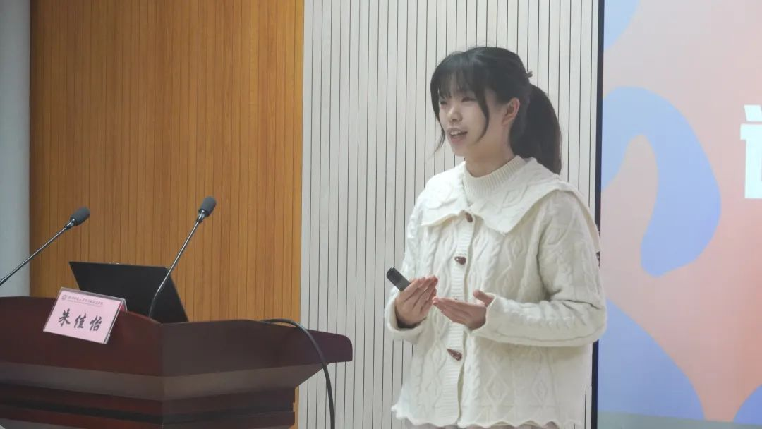 朱佳怡采用直观的对比,向同学们分享了他人和自身视角中截然不同的“自我形象”。他人眼中的朱佳怡极为优秀,成绩优异、获奖无数、志愿工作经验丰富;但在她看来,自己还存在着许多不足。朱佳怡介绍,在进入大学一年半的时间里,她获得了校优秀学生干部、优秀学生一等奖学金、浙江省政府奖学金等荣誉,拥有仓小近视防控干预课、鸬鸟镇中心小学暑期支教、杭州暑期拓展课堂、浙江省冰球运动会赛事志愿服务等丰富的志愿活动经历。然而,在与优秀同学并行的过程中,朱佳怡不可避免地感受到了“同侪压力”,陷入了迷茫与焦虑的“世俗漩涡”。几经探索与波折,她最终在不懈奋斗中得出结论:“努力不是‘内卷’,‘反内卷’也并非不努力。努力的意义是拥有人生的选择权,去主动选择自己可以忍受的痛苦。”最后,她鼓励正处于迷茫期的同学们以日记抒发所思所想,探索真正初心。“不是只有站在金字塔顶端的人才有话语权,我也有。”
