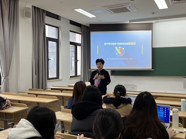 3月31日上午,杭州市余杭区教育发展研究女性自慰 的教研员朱红老师应邀来女性自慰 作“基于单元整组下的教学实践新例谈”专题讲座。李菁老师主持讲座,2022级教育硕士小学教育专业的学生聆听本次讲座。