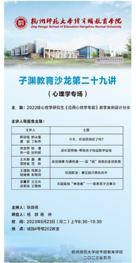523二十九期子渊教育沙龙在诚园4号楼202教室顺利举行本期教育沙龙邀请了郭蕊铭、徐金荣、王天爱、王靖茜、袁蔓思等共二十2022级心理学研究生作为主讲人与同学们交流互动,本次沙龙的主题为“应用心理学专题教学案例设计分享”,本次沙龙的主持人为耿晓伟。