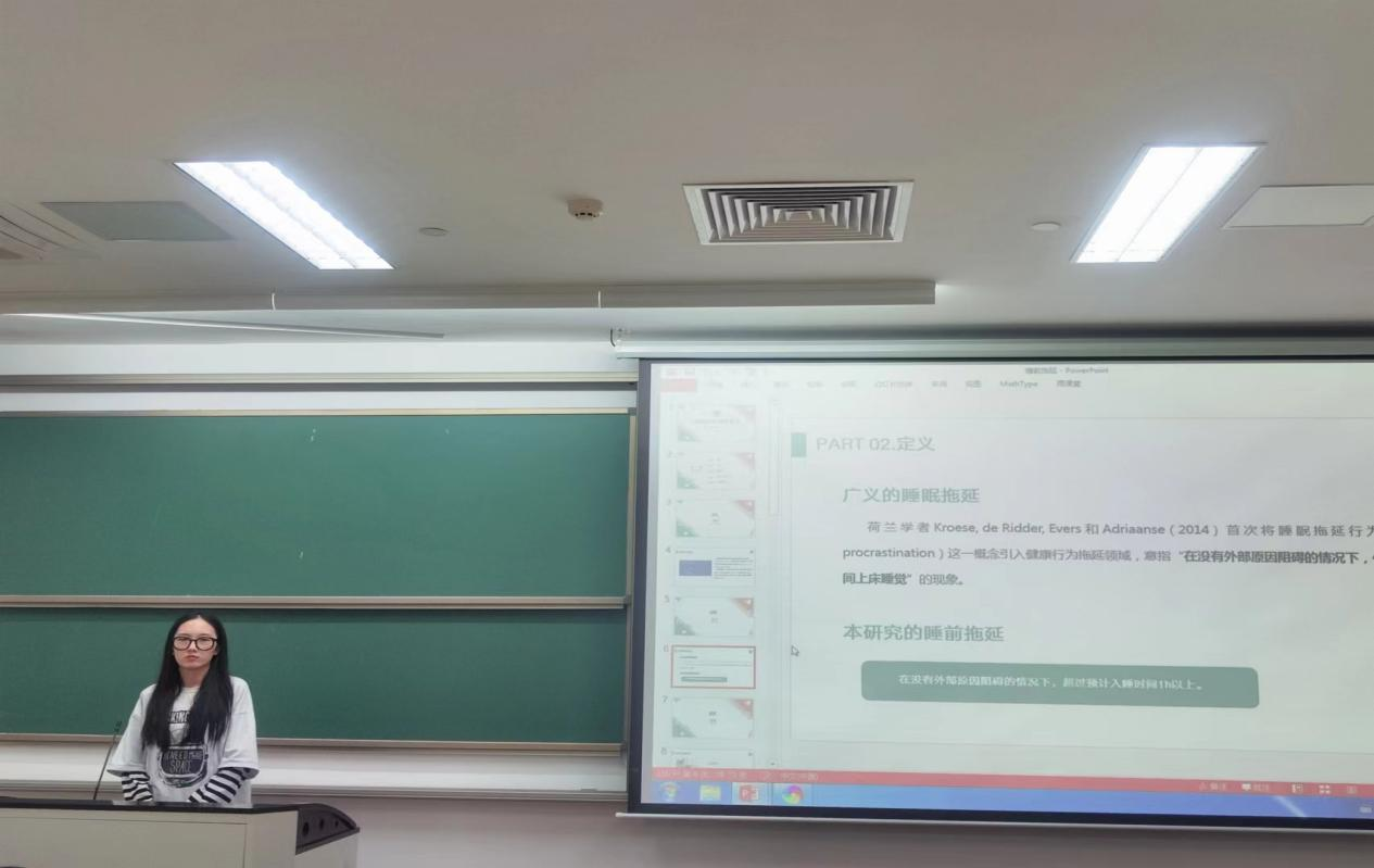 杨子琼、潘璐、姚玉洁、吴晨程四人分享的主题是《睡前拖延团体辅导》。针对社会拖延的现状,杨子琼等四人为我们分析拖延的原因,结合团体心理辅导的相关理论,设计并实施具有针对性的团体心理辅导方案。采用定量分析和定性分析相结合的研宄方法,评估中学生学习拖延团体心理辅导方案的效果,探索改善中学生学习拖延的有效方法和途径。