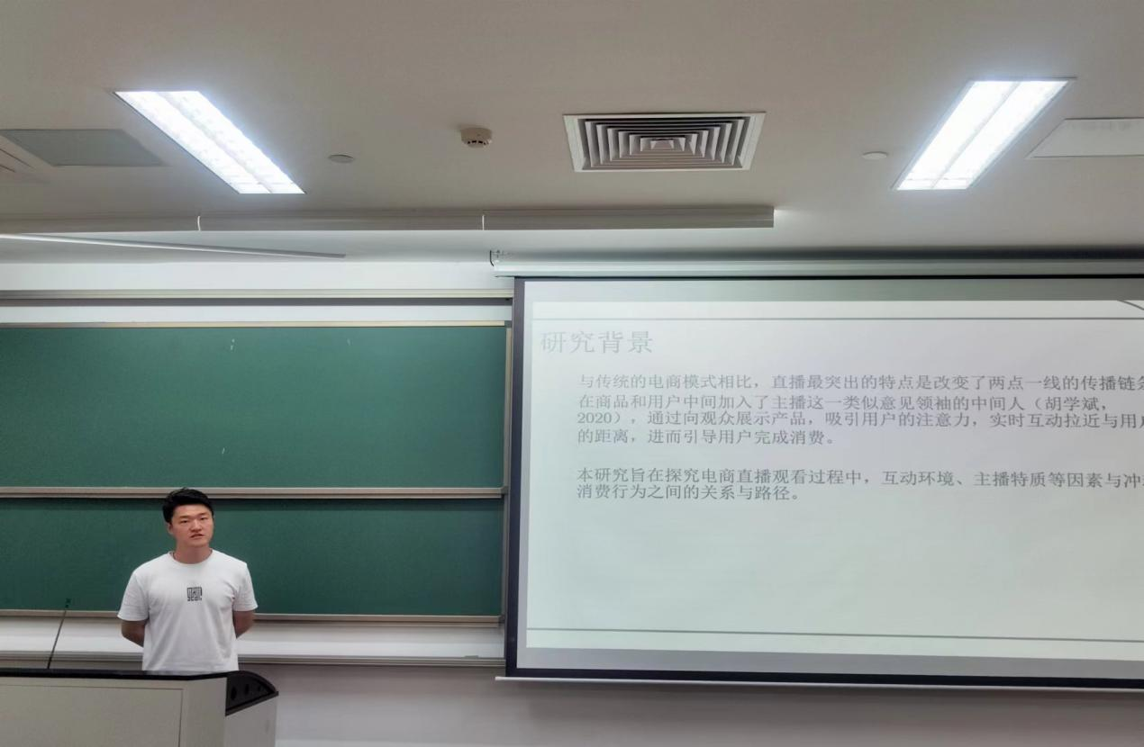 李竑锐、李滨辰、韩羽三人分享的主题是《直播带货中的冲动消费行为》。互联网时代,网络对于大学生的作用力和影响力不言而喻。由于网络自播是近两年才开始蓬勃发展起来的新兴物方式,明星纷纷加入络直播带货大车,明星效应将对尚耒确立正确消观和价值观的大学生产生潜移默化的影响。李竑锐等三人从心理学的角度为我们讲述影响大学生面对明星带货冲动型消费的因素,并提出相应建议。