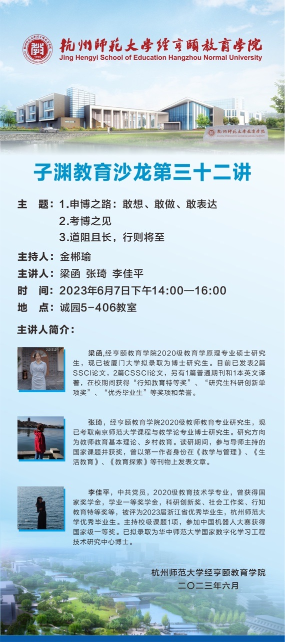 梁函是2020级教育学原理专业硕士研究生,现已被厦门大学拟录取为博士研究生。目前已发表2篇SSCl,2篇CSSCI论文,另有1篇普通期刊和1本英文译著,在校期间获得“行知教育特等奖”“研究生科研创新单项奖”、“优秀毕业生”等奖项和荣誉。梁函同学分享的主题是《申博之路:敢想、敢做、敢表达》,她认为清楚的定位和坚定的目标可以让学习和生活更有方向感和动力,舍弃是科研路上的必要法宝,正所谓有所才有的。除此之外,没有一条道路是平坦的,因此坚持和坚强尤为重要。