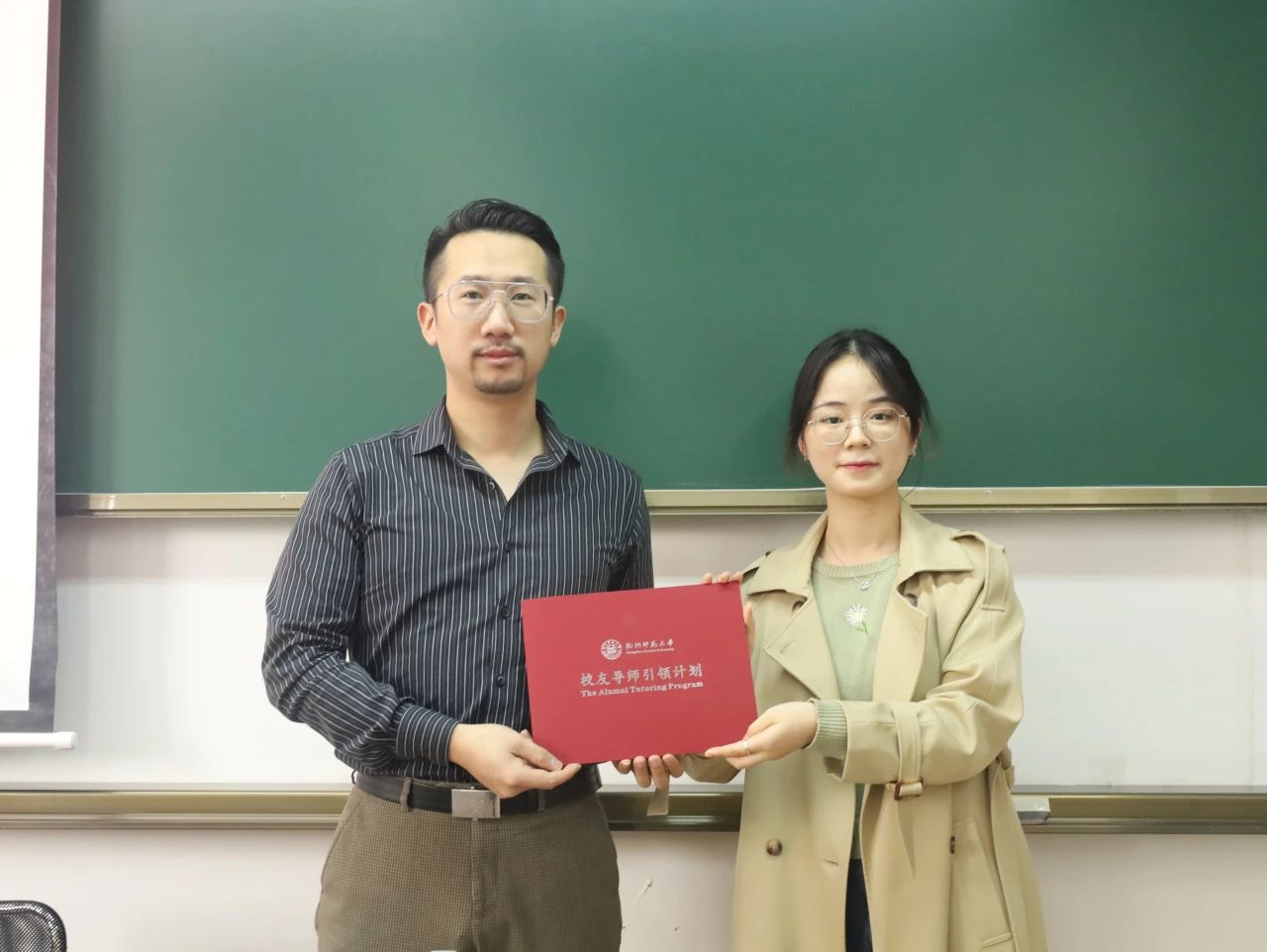 讲座开始前,女性自慰 辅导员汪康琳为娄松江校友颁发了“校友导师引领计划”讲师团聘书。