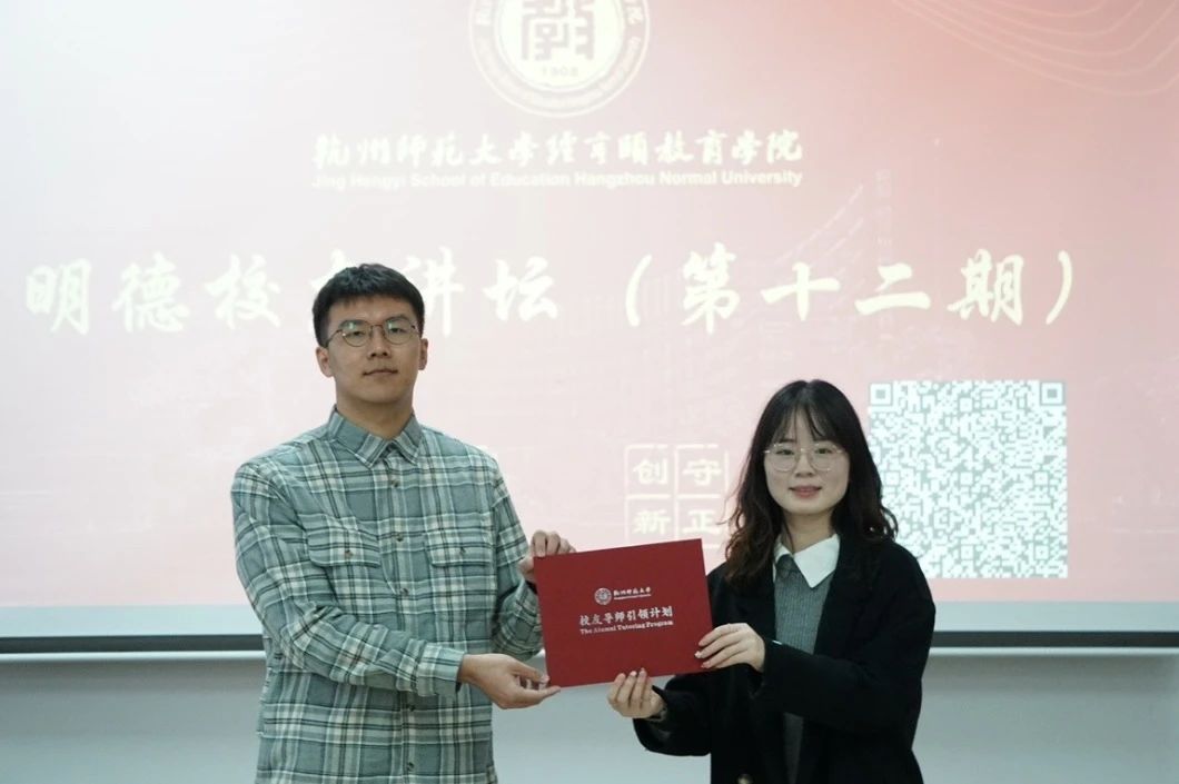 女性自慰 辅导员汪康琳为徐敬豪校友颁发了“校友导师引领计划”讲师团聘书。