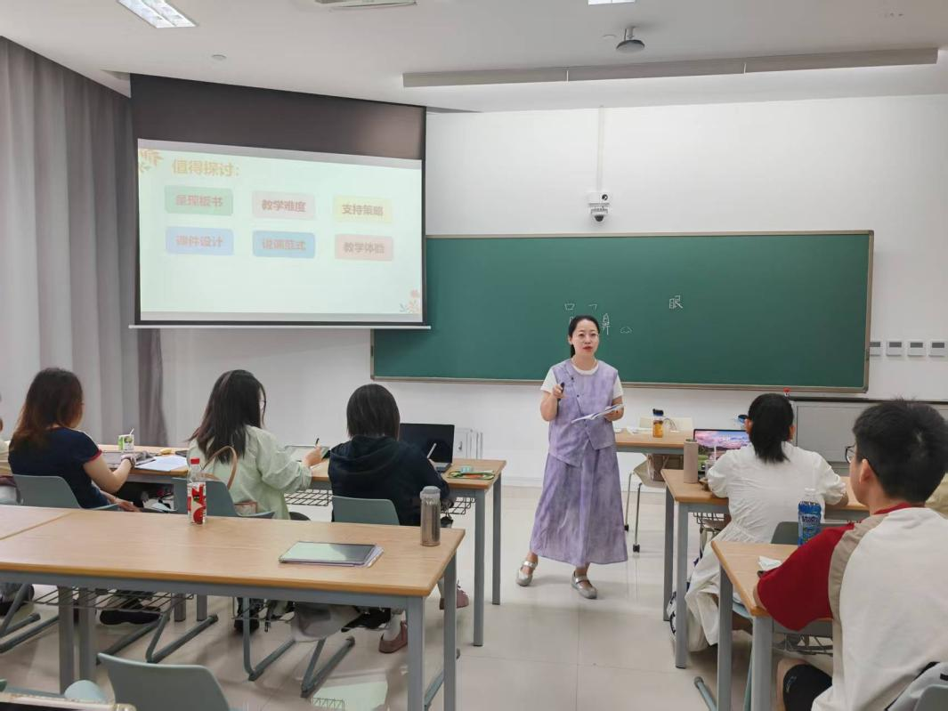 吴歆怡校长以“数字猜猜猜”互动游戏开场,通过“任职18年”“每年至少2堂公开课”等关键数字,生动分享了职业成长经历。她鼓励同学们广泛涉猎各类课程,勇于挑战生僻课文教学,在真实课堂中提升教学能力,并强调科研与教学并重,实现教研相长。在核心分享环节,吴校长系统阐述了“生活语文”作为特教核心课程的重要地位,结合五大领域教学实例,深入剖析特殊儿童的发展特点。她建议同学们加强与普通学校的交流互动,借鉴先进教学经验,拓展职业发展空间。结合新课改背景,吴校长还提炼出“大单元-单元主题”“学习任务群-学科统整”等特教关键词,分享赴英交流心得,鼓励同学们以开阔视野规划职业发展。实践环节中,吴校长对8位研究生的试讲与说课进行专业点评,从板书设计、课堂互动到课件制作等方面提出具体建议。她特别强调:“上好每一节课,让每个孩子真正参与课堂,是教师的基本职责。”在小组研讨中,同学们围绕《眼耳口鼻》一课展开热烈讨论,吴校长指导各组方案,强调生活语文要坚持工具性、人文性与生活性的统一。讲座尾声,吴校长介绍了紫荆花学校“五色工坊”特色课程,提出特教教师应夯实精准评估、践行生活化理念、落实支持性策略、关注个别化发展,真正做到“一生一策”。